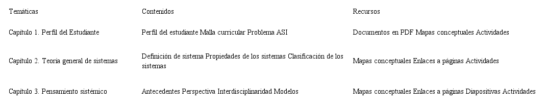 En el RED se consideran tres temáticas del curso de Introducción a la Administración de Sistemas Informáticos -IASI-: i) perfil del estudiante, en la que se incluye el Proyecto Educativo del Programa Curricular, la malla curricular en detalle, y las particularidades de la profesión, en relación con las disciplinas que la conforman (historia, formación y desempeño profesional); ii) teoría general de sistemas, se define el concepto de sistema y se relacionan las propiedades y las clasificaciones de los sistemas; y iii) pensamiento sistémico, se revisan sus antecedentes, su relación con la perspectiva para analizar un sistema y su aporte a la interdisciplinariedad y al modelaje.
