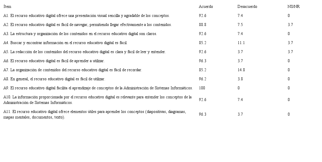 Para esta encuesta, los ítems en el nivel de facilidad de uso fueron: i) Preguntas A1-A8: presentación visual, navegación, estructura, búsqueda, idioma, aprendizaje y facilidad de uso; ii) Preguntas A9-A11: elementos de evaluación de contenidos, aprendizaje de conceptos, pertinencia de la información y calidad de los recursos; y iii) Preguntas B1-B4: elementos de evaluación del diferencial semántico, presentación visual de conceptos, elementos del RED, facilidad de acceso y comprensión de los elementos, facilidad de aprendizaje de conceptos y utilidad de los elementos del RED.