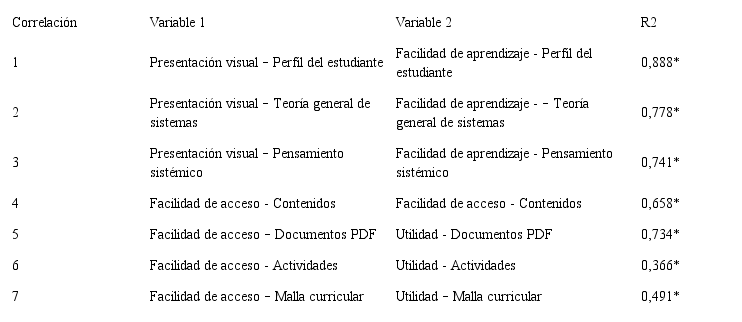 En la tabla 3, por su parte, se presentan las correlaciones entre diferentes ítems de diferencial semántico. Se descubrieron correlaciones entre la presentación visual de cada apartado del RED y su facilidad para aprender los conceptos correspondientes. Además, se encontraron correlaciones entre la facilidad de acceso a los diferentes elementos del RED y su utilidad, percibida por los estudiantes, excepto para el elemento ‘Actividades’. Los resultados indican que el elemento ‘Actividades’ debe ofrecer mejores propuestas para poder afianzar los conocimientos ofrecidos.