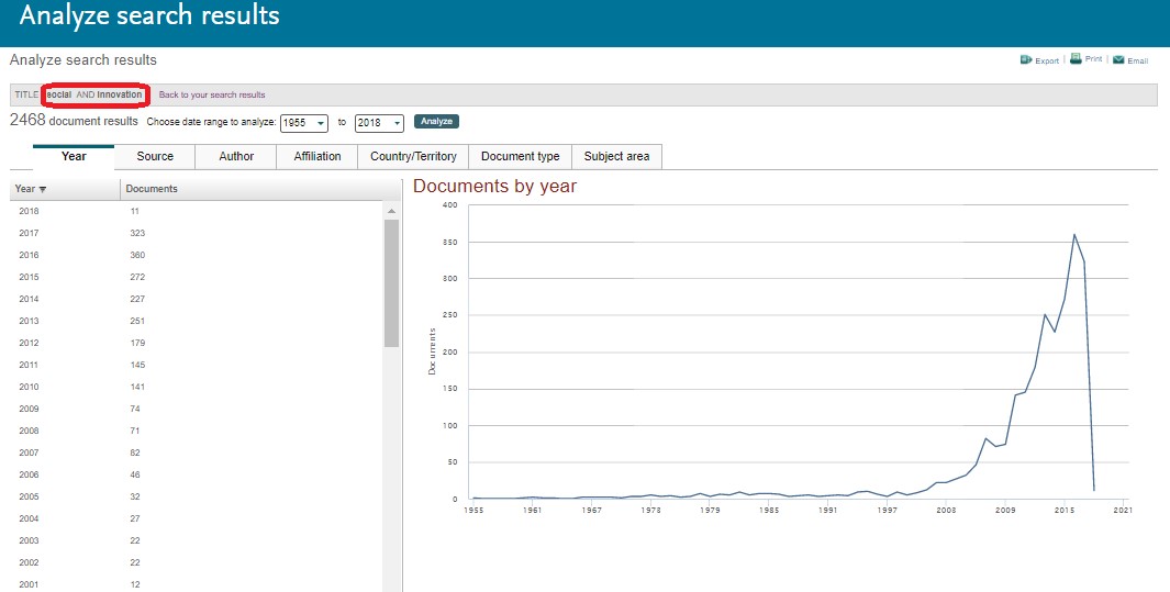 Por lo anterior, es fundamental introducir a la universidad como un agente que tiene poder para incidir en innovación social, dado que sobre este tópico, académicos y científicos de diversos campos del conocimiento han escrito desde su perspectiva disciplinar, sea en ciencias sociales, humanidades, administración y negocios; medicina; ingenierías; ciencia medioambiental; ciencias biológicas y agricultura, entre otros. Es decir, se presenta un interés creciente por el tema de innovación social para las comunidades académicas, asunto que se puede corroborar en una sencilla búsqueda en Scopus, la cual denota, claramente, que en la década de los años 90 y mucho más en los últimos 10 años, se dispara el número de artículos y demás productos de nuevo conocimiento publicados sobre innovación social (ver figura 1).