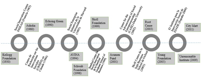 Los centros académicos son claramente visibles y desempeñan un papel clave en el campo de la innovación social, pues su labor de investigación y sus esfuerzos para tender puentes con otras organizaciones, gobiernos y empresas son altamente valiosos. También, por todo el mundo existen fundaciones y organizaciones que trabajan en el campo de la innovación social, y cuya labor de concienciación y apoyo financiero para la promoción de proyectos innovadores tiene un valor incalculable. En la figura 2 se muestra una línea de tiempo que da cuenta de los más destacados centros académicos, fundaciones y organizaciones según el año de creación:
