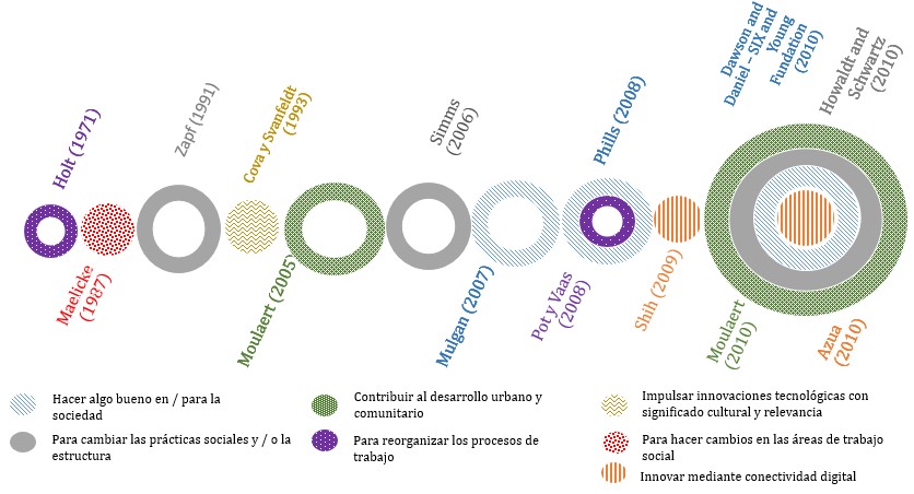 En el trabajo investigativo de Rüede & Lurtz (2012) se dan a conocer siete (7) categorías para entender la innovación social, a saber: i) “para hacer algo bueno en/para la sociedad”; ii) “para cambiar las prácticas y/o estructuras sociales”; iii) “para contribuir con el desarrollo urbano y la comunidad”; iv) “para reorganizar los procesos de trabajo”; v) “para imbuir innovaciones tecnológicas con sentido cultural y relevancia”; vi) “para hacer cambios en el área de trabajo social”; y vii) “para innovar a través de la conectividad digital” (p. 7).