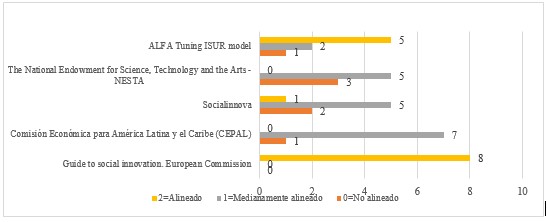 Ocho (8) de las universidades elegidas se alinearon con la definición de la Comisión Europea, cinco (5) con la definición de ALFA Tuning ISUR, y una (1) con la de Socialinnova. Esto da cuenta de un acuerdo importante en comprender la innovación social como producción de nuevas ideas para la generación de bienestar, a partir de la colaboración e interacciones y el desarrollo de capacidades. Siete (7) universidades dijeron estar medianamente alineadas con las definiciones de la CEPAL, cinco (5) coinciden en este nivel de alineación con las definiciones de NESTA y Socialinnova, y dos (2) están medianamente alineadas a lo propuesto por la definición de ALFA Tuning ISUR. Tanto la definición de Socialinnova como la de CEPAL comparten la idea de cambio y replicabilidad, mientras que la de NESTA da un énfasis especial a la idea de construcción de bienes sociales y públicos. Podrían considerarse focalizaciones de una idea general planteada por la Comisión Europea, con la cual están de acuerdo la mayoría de las instituciones. Se denota una mayor proporción (38%) de las universidades no alineadas con las definiciones de NESTA, seguido por la no alineación propuesta por Socialinnova (25%).