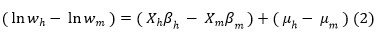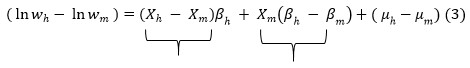 Según Blau (1998), la discriminación existe en el mercado laboral cuando dos individuos con las mismas características observables son tratados de un modo distinto, sólo por la diferencia en su género; y es por eso que la brecha salarial podría estar asociada con la diferencia en la remuneración a los atributos no observables. En la primera parte, se inicia con una ecuación minceriana para el logaritmo natural de los salarios de los hombres y las mujeres, presentada a continuación: