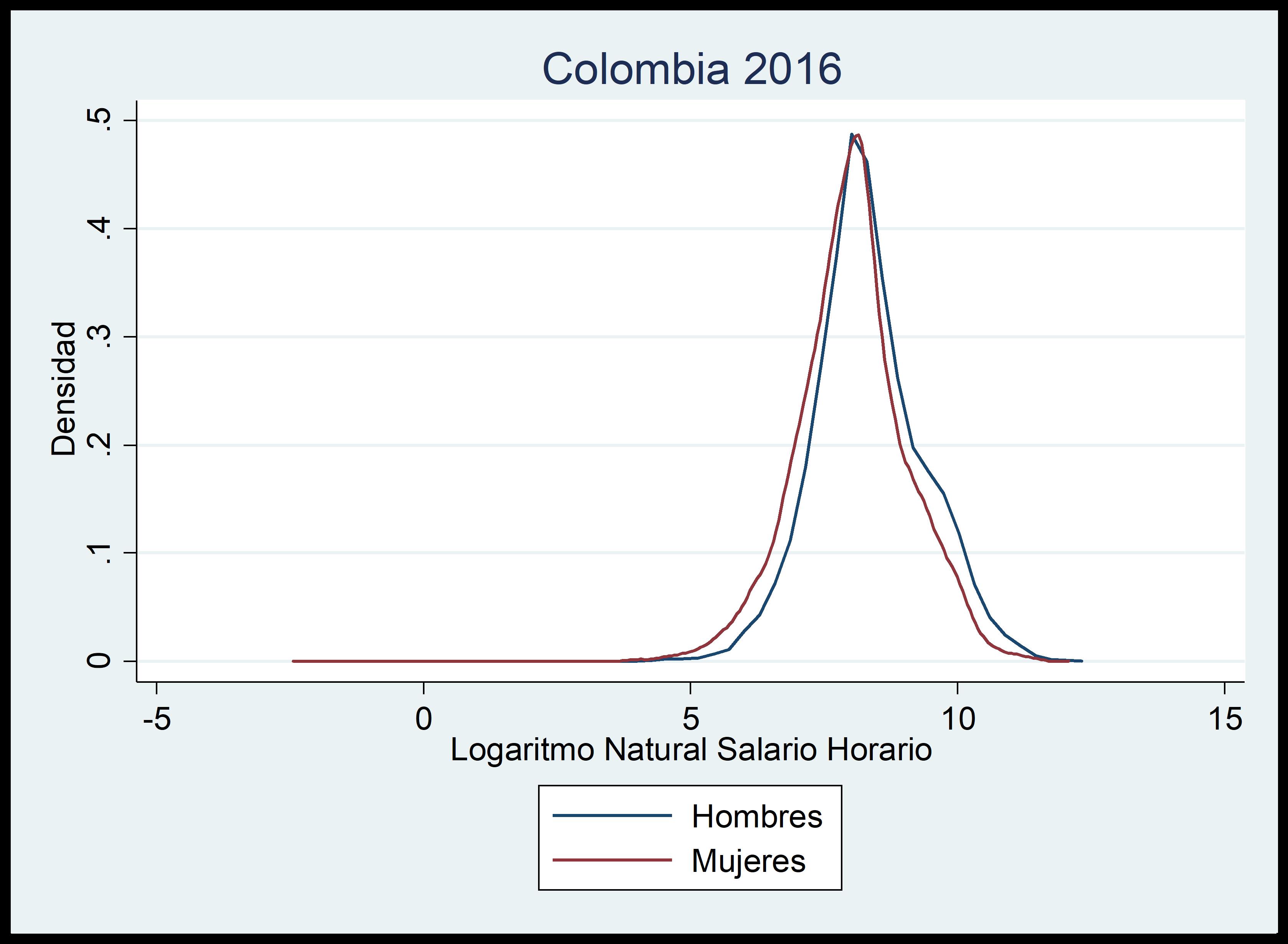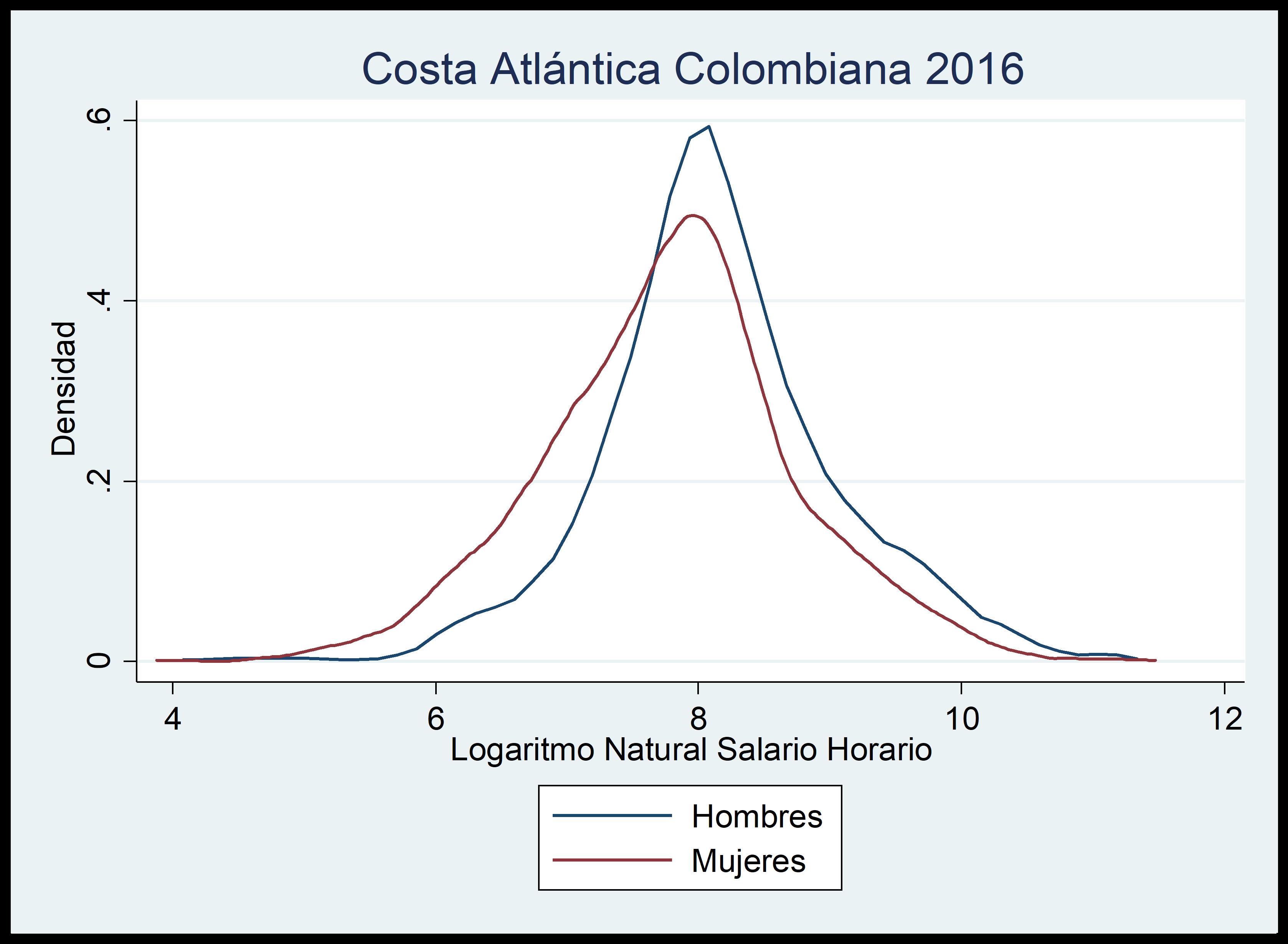 Elaboración propia con base en GEIH (Dane, 2017)Finalmente, en las figuras 1 y 2 se muestran las funciones de densidad del logaritmo natural del salario horario entre hombres y mujeres, para el caso de Colombia y los departamentos de la costa atlántica, en el año 2017. En ambos casos se observa que la densidad de los hombres se inclina más hacia la derecha, en comparación con la función de las mujeres, indicando que la distribución de los salarios de los hombres tiende a ser mayor; es decir, en promedio, los hombres devengan mayores salarios que las mujeres.