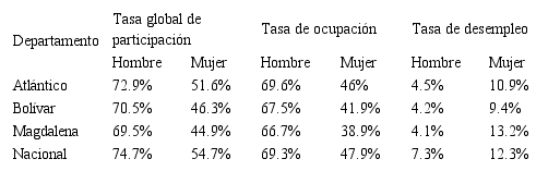 De igual forma, la tasa de desempleo de los hombres y mujeres estuvo por debajo del promedio nacional, para todos los departamentos, con excepción del Magdalena, en donde se ubicó por encima del promedio nacional. Es de resaltar que la tasa de desempleo en todos los casos fue mayor en las mujeres, mientras que la tasa global de participación de las mujeres fue menor que la de los hombres; y para todos los departamentos, fue menor que el promedio nacional. Si bien, las cifras en el contexto nacional muestran un panorama desalentador, la situación es aún más preocupante para los tres departamentos de la costa atlántica, pues están por debajo del promedio nacional; jalonando estos indicadores a la baja, en un país como Colombia, caracterizado por presentar altos índices de desigualdad.