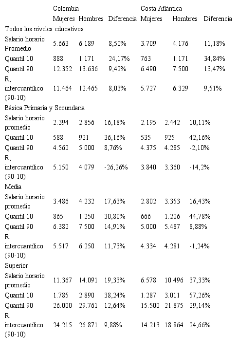 Para el 10% de los individuos con menos ingresos y que tienen un nivel de educación media, existe una diferencia del 44,78%, en la costa atlántica, y del 30,80% en Colombia, a favor de los hombres. Para el caso del 10% de quienes tienen mayores ingresos y que han alcanzado un nivel de educación superior, presentan diferencias relativamente mayores (ver tabla 2).