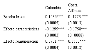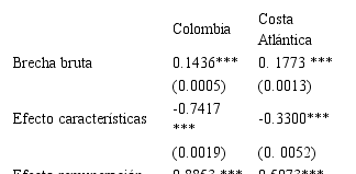 Como era de esperarse, Colombia no es ajena a este fenómeno. Como la brecha no es homogénea entre todo el territorio nacional, justifica hacer un análisis minucioso de lo que sucede en los departamentos de la costa atlántica y el territorio nacional. Los hallazgos permiten demostrar que existe una diferencia salarial pronunciada a favor de los hombres. Para poder entender de la mejor manera la situación, se desarrolla la descomposición de Blinder – Oaxaca. Los resultados de las estimaciones indican que la brecha salarial no se explica únicamente por las características medibles de los individuos, sino que también intervienen, principalmente, características o variables no observables, que hacen parte del efecto remuneración, evidenciando que los hombres con las mismas características que las mujeres tienden a tener mayores salarios.