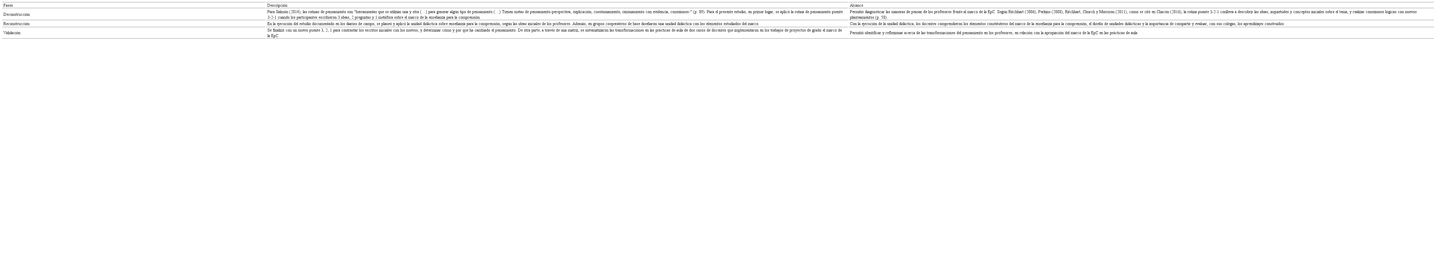 En el estudio se empleó la investigación acción pedagógica. Para Ávila (2005) este tipo de investigación “busca explorar las intimidades de las prácticas pedagógicas, en el ámbito de la escuela. (…) para tomarlas como objeto de estudio, explicitando los problemas y las preguntas que ‘surgen’ de los agujeros y de los intersticios de su práctica” (p. 505). A través de la deconstrucción (contextualización y crítica), reconstrucción (modificación de las formas de enseñar) y la validación (determinación de la efectividad) de la práctica alternativa (Restrepo, 2004, p. 50), como se indica en la tabla 1.