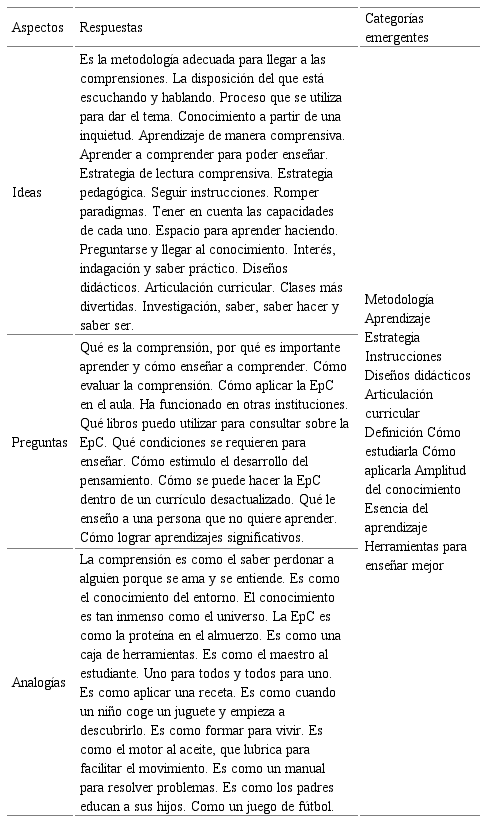 De acuerdo con lo anterior, los docentes concebían en un primer momento la EpC como una metodología relacionada con procesos, estrategias, instrucciones y diseños didácticos en la articulación curricular, para el logro de los aprendizajes; las preguntas se relacionaron con definiciones, cómo estudiarla y aplicarla; y las comparaciones hicieron alusión a la amplitud del conocimiento, la esencia del aprendizaje y como herramientas para enseñar mejor. Según esta primera aproximación, se constata que los docentes participantes en la investigación no habían tenido contacto directo con el marco de la enseñanza para la comprensión. Situación evidenciada en la limitación de las definiciones, la confusión de algunas ideas y afirmaciones fuera de contexto.