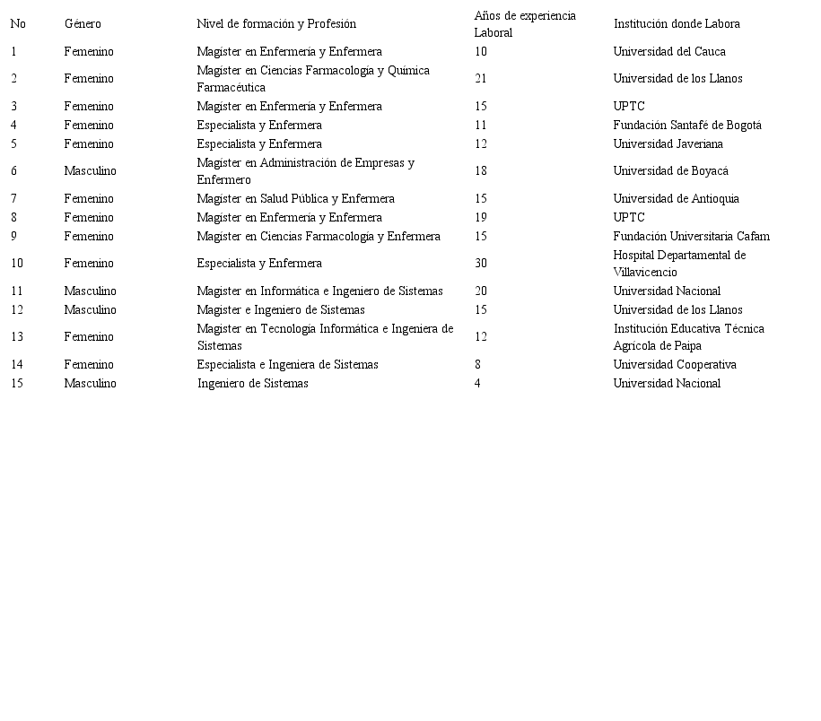 Se contó con la validación de expertos de diferentes áreas de desempeño e instituciones, cuya trayectoria se caracterizó por atesorar amplia experiencia en enseñanza en enfermería, especialmente en farmacología, experticia clínica y manejo de sistemas y computación, lo cual permitió que la labor emprendida fuera lo más idónea posible. Veinte profesionales recibieron carta de invitación, vía e-mail, para participar del estudio, de los cuales cinco se negaron a intervenir por falta de tiempo para realizar la validación. En la tabla 1 se observa la caracterización del equipo de evaluadores.