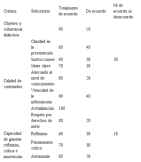 Los resultados del cuestionario fueron significativamente satisfactorios; la mayoría de los ítems puntuaron entre de acuerdo y totalmente de acuerdo, como se observa en las tablas 2 y 3. Los criterios que recibieron mejor valoración fueron calidad de los contenidos, capacidad de generar reflexión, crítica e innovación y motivación. El módulo 4, denominado Necesidades de líquidos en Pediatría, fue el mejor evaluado.