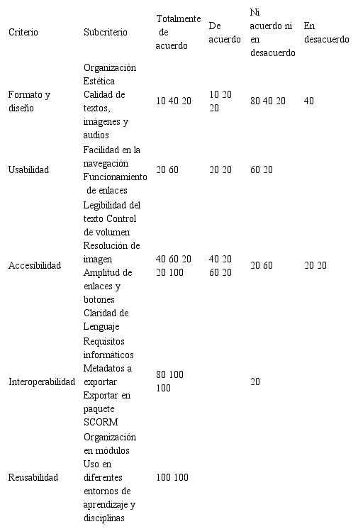 El cuestionario utilizado fue la herramienta de calidad de objetos de aprendizaje COdA versión 1.1 (Fernández, Domínguez y de Armas, 2012). Cada criterio se desglosa a su vez en subcriterios, de cuyo cumplimiento depende la puntuación total obtenida. Se utilizó escala de preguntas con 5 repuestas, con valores de 1 a 5; 1 = totalmente en desacuerdo, 2 = en desacuerdo, 3 = ni en acuerdo ni en desacuerdo, 4 = de acuerdo y 5= totalmente de acuerdo. Se envió por correo electrónico al grupo de expertos, junto con las indicaciones para ingresar al OVA.