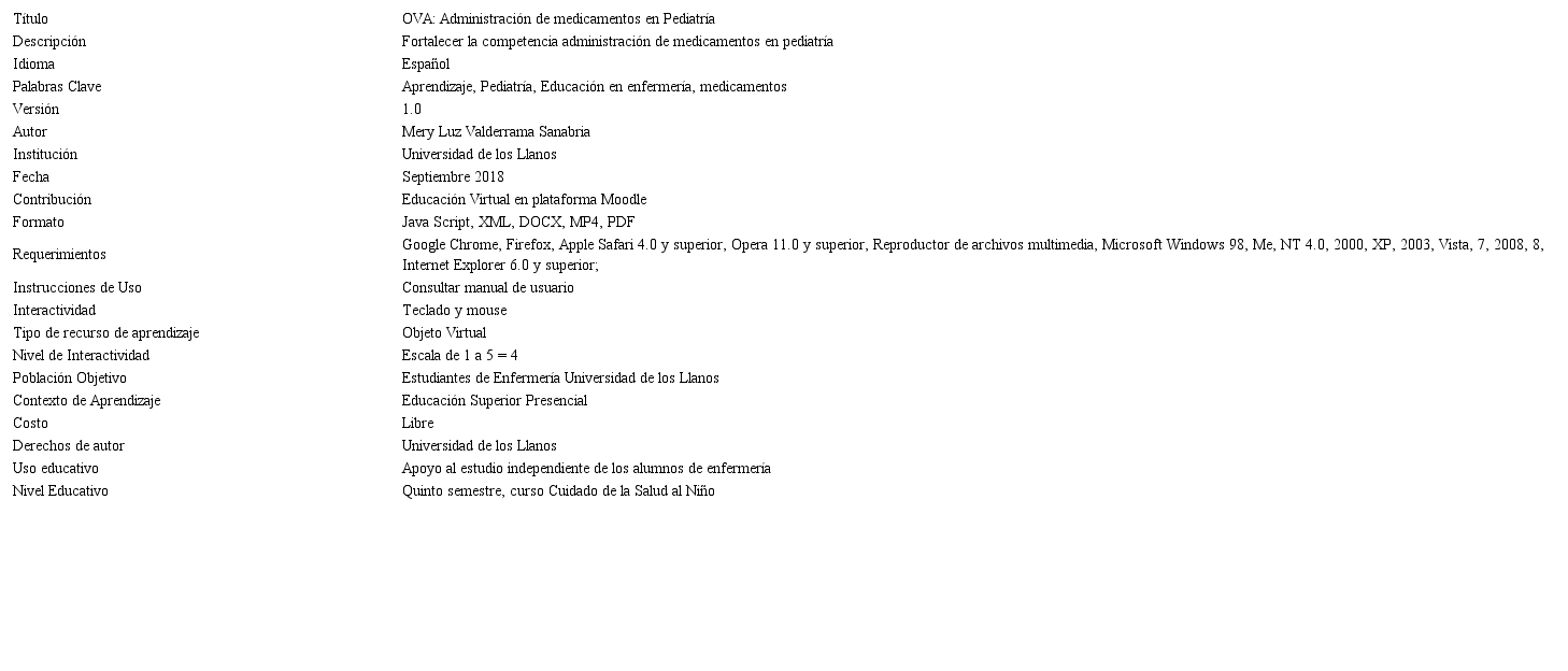 El contenido del OVA contó con diversos recursos, tales como imágenes, videos, archivos de consulta, figuras, animaciones, entre otros, para capturar la atención del estudiante; de esta forma se logró mantener el interés por el tema enseñado. Asimismo, las actividades de aprendizaje, lo permitieron hacer significativo y desarrollar habilidades como el cálculo de dosis, que resulta ser complejo para el estudiante.