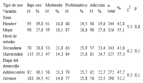 En lo referente a la etapa del desarrollo, se encontró que en los adolescentes el 30,14% tiene bajo uso de Facebook, el 21,32% uso moderado, el 25,73% uso problemático y 22,79% adictivo; similares a los comportamientos de los porcentajes en los jóvenes el 34,56% tuvo bajo uso, 25,83% fue uso problemático, 25,50% fue uso adictivo y el 14,09% tuvo uso moderado. No se encontraron asociaciones significativas entre el tipo de uso de Facebook con el nivel de estudios y la etapa de desarrollo (ver tabla 1).