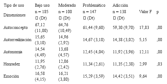 Los resultados muestran la existencia de diferencias entre cada tipo de uso de Facebook y los puntajes de la prueba de autoconcepto y las dimensiones de autorrealización, autonomía, honradez y emoción (ver tabla 2).