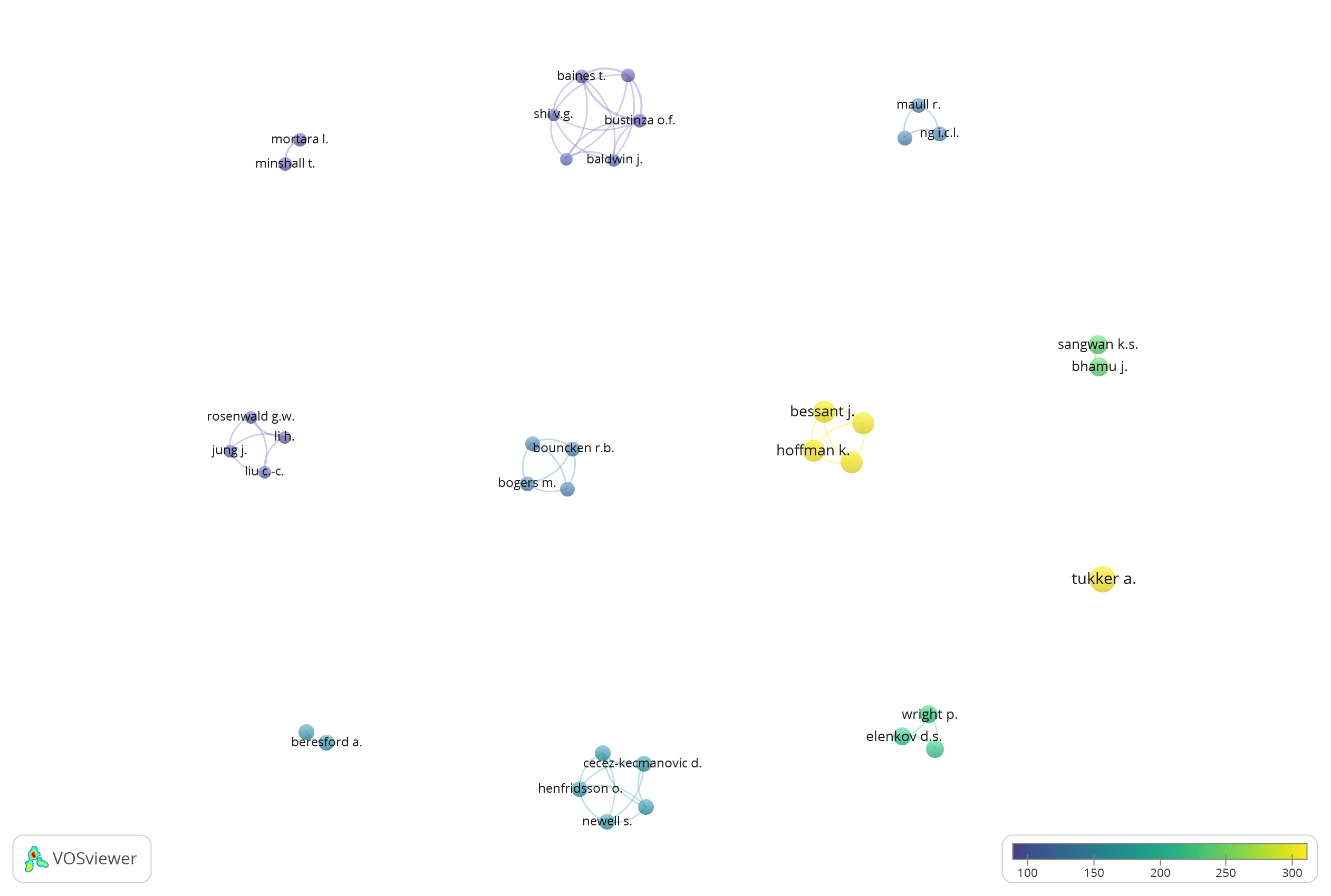 Los autores Cecez-Kecmanovic D. de la Universidad de Nueva Gales del Sur (Australia), Galliers R.D., Newell S. de la Universidad de Bentley (Estados Unidos), Henfridsson O. de la Universidad de Warwick (Reino Unido), Vidgen R. de la Universidad Hull (Reino Unido) trabajan igualmente en red de manera conjunta y colaborativa en la producción científica, se observan publicaciones a partir del año 2014, han producido un artículo y ha sido citado 107 veces. Los autores Bhamu J. y Sangwan K., del mismo modo, trabajan de manera conjunta en el Instituto Birla de Tecnología y Ciencia (India), han producido un artículo hacia el año 2015 y ha sido citado 128 veces.