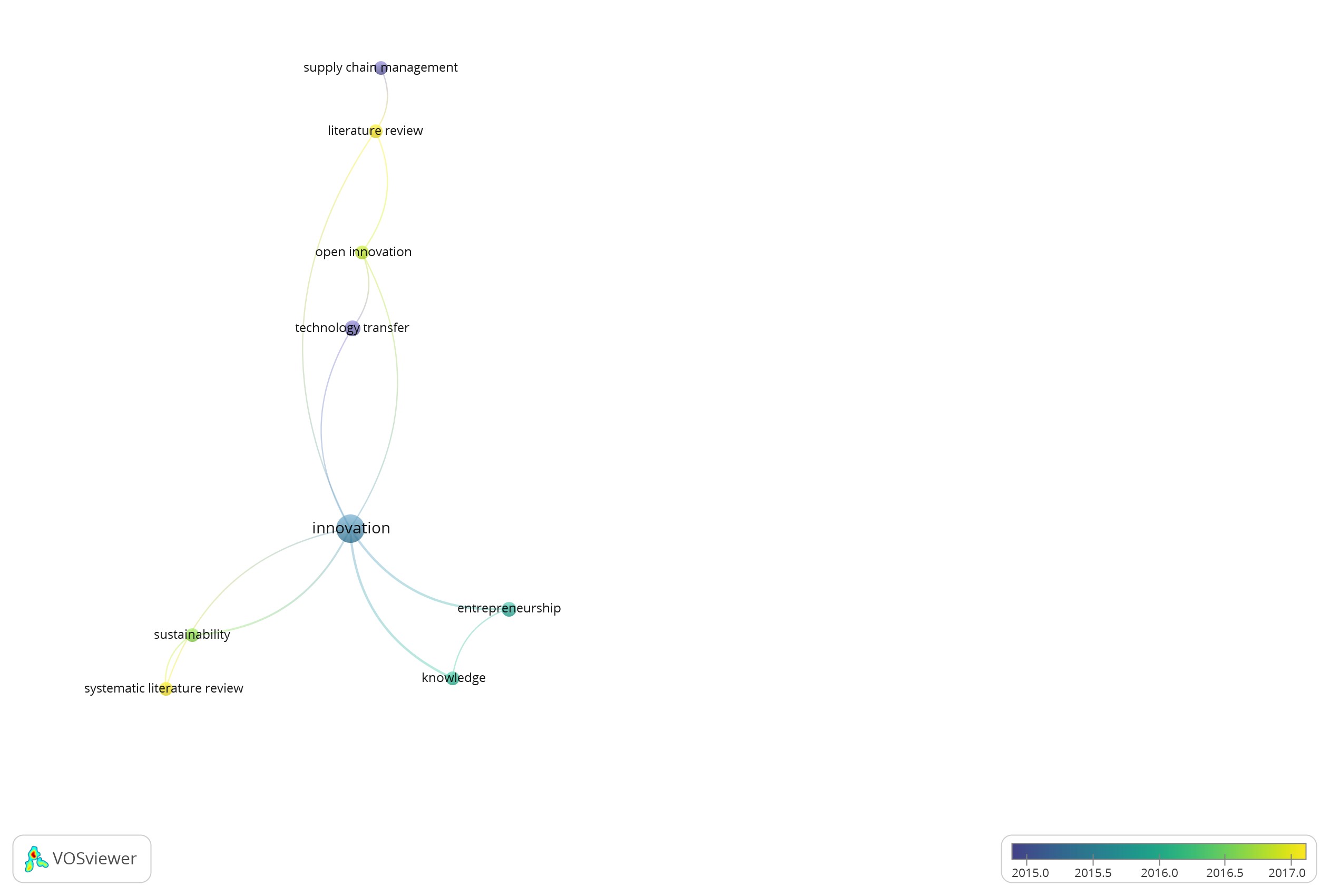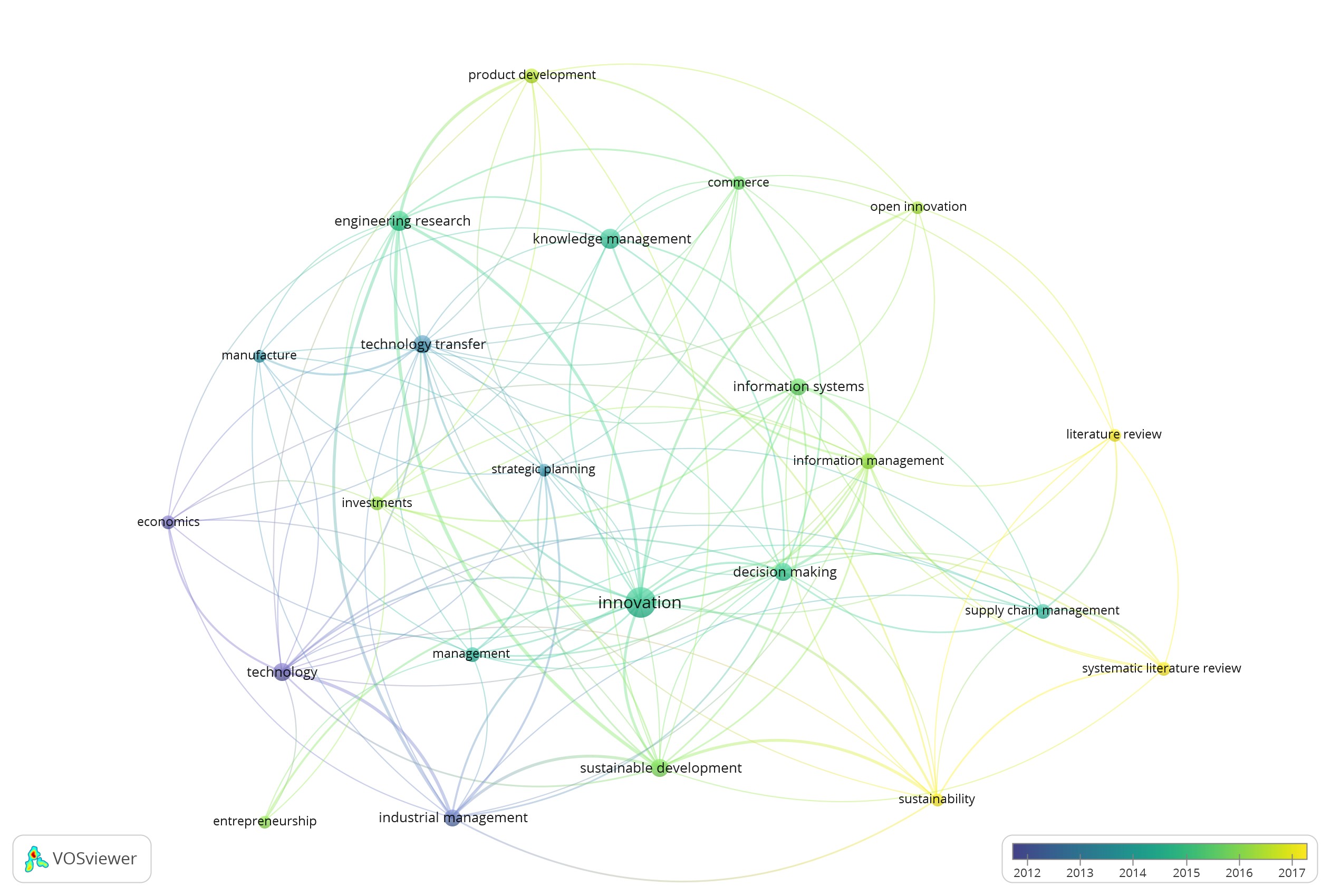En este caso para generar la red, el número mínimo de concurrencias seleccionadas entre las palabras clave fue de 9, obteniendo un total de 20 palabras clave. Las palabras que sobresalen en esta red son: innovación, gestión de conocimiento, gestión industrial, investigación en ingeniería, tecnología, desarrollo sostenible, toma de decisiones, transferencia tecnológica; son los temas de mayor influencia en la literatura científica de GTI en el sector defensa, lo que permite identificar un nivel alto de coherencia respecto a las variables estratégicas clave identificadas en la revisión de la literatura. Las tres palabras con mayor número de concurrencias son: innovación (54), gestión de conocimiento e investigación en ingeniería (24), desarrollo sostenible y transferencia tecnológica (19).