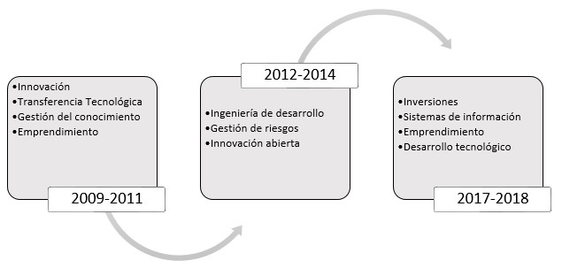 En la Figura 11 se muestran las tendencias identificadas, en torno a la temática de investigación, a partir de las palabras clave utilizadas a lo largo del periodo de estudio. Aquí se ha identificado una tendencia marcada, en los últimos dos años, en tanto las palabras clave que están emergiendo son: “sistemas de información”, “emprendimiento”, “inversiones”, “comercio” y “desarrollo tecnológico”. Esto se relaciona con que, para las Fuerzas Militares y la industria de defensa, el desarrollo tecnológico producto de la I+D+i, impacta a otras industrias civiles como una manera de cooperar, porque permite construir y actualizar tecnologías duales (civil-militar) de manera más rápida y económica, lo cual se logra con el uso de productos comerciales (Aloini, Dulmin, Mininno, Pellegrini & Farina, 2018; Chavez, Stinnett, Tierney & Walsh, 2017; Kerlooza, Setiawan & Asrianto, 2018; Lacity, Khan & Carmel, 2016; Maestre Góngora & Nieto Bernal, 2017; Simplício, Gomes & Romão, 2017; Sottilotta, 2016)