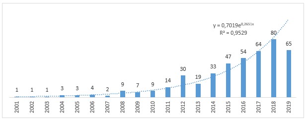 La Figura 1 muestra un creciente interés en el tema. Entre los años 2001 y 2010 se observa un comportamiento constante en la producción de conocimiento en la temática analizada. Es a partir del año 2011 que se evidencia un aumento apreciable y constante en el número de publicaciones, lo que puede indicar una mayor adopción de la GTI en el sector defensa. Adicionalmente, se puede observar que la mayor parte de las publicaciones se han desarrollado entre los años 2014 y 2019, destacándose un crecimiento exponencial en ese periodo.
