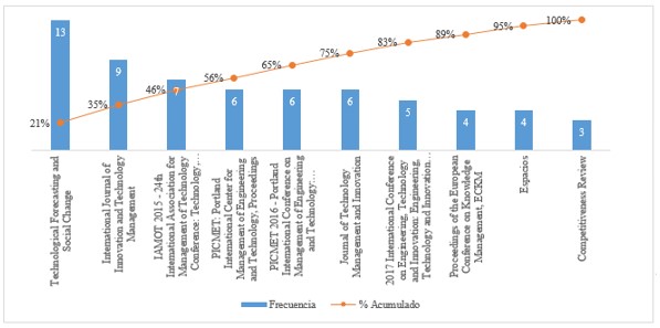 De manera específica, la revista “Technological Forecasting and Social Change” (Elsevier Science, 2002) es la revista con mayor cantidad de registros, con 13 artículos publicados; esta revista de Holanda, presenta temas de predicción tecnológica y cambio social; es una revista académica revisada por pares, publicada por ElSevier, que analiza los estudios futuros tecnológicos. La revista “International Journal of Innovation and Technology Management” es de Singapur y es la segunda con 9 artículos (Inderscience, 2019); en esta publicación se presentan artículos sobre problemas y desafíos gerenciales, provocados por el acelerado avance tecnológico en el contexto mundial, que abordan todos los aspectos del proceso de innovación, desde la conceptualización hasta la utilización comercial. Los temas cubiertos incluyen activos y gestión del conocimiento, introducción de nuevos productos y transferencia de tecnología.