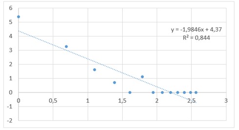 Para verificar el ajuste estadístico, se aplicó el logaritmo natural a cada uno de los ejes de la Figura 2, obteniéndose la ley de productividad para las revistas. Esta ley postula que la productividad no sigue una distribución lineal, sino logarítmica; por tanto, se puede inferir que "cuantos más artículos publicados tenga un autor, más fácil le resultará producirlos y publicarlos” (Urbizagastegui, 2018). Al realizar este análisis, los autores de un determinado conjunto de publicaciones se distribuyen en tres niveles de productividad: los pequeños productores (log n = 0), los productores de medios (1> log n> 0) y los grandes productores (log n> 1). El valor al cuadrado del coeficiente de regresión del ajuste, en el número acumulado de artículos, frente al logaritmo natural de las revistas es mayor que 0,8, lo que demuestra un ajuste adecuado para el modelo propuesto de productividad (Figura 3).