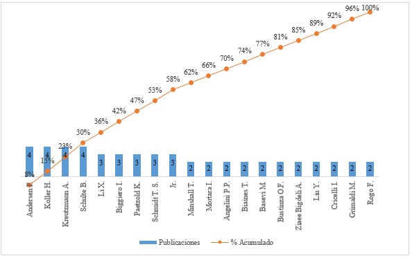 Los autores con mayor producción científica (4 artículos), Andersen F., Koller H., Schulte B., Kreutzmann A., pertenecen al Instituto de Tecnología y Gestión de la Innovación de la Universidad Helmut-Schmidt, Alemania. Con 3 publicaciones se encuentran Li, X., profesor asociado de la facultad de economía y gestión, de la Universidad Tecnológica de Beijing, China; con experiencia de investigación en el desarrollo de manufactura moderna de Beijing, y trabaja en coordinación con el instituto de investigación de innovación de la Universidad de Manchester, Reino Unido. Paetzold, K., Schmidt, T.S., son profesores asociados del Instituto de Tecnología y Gestión de la Innovación, Universidad de las Fuerzas Armadas Federales de Munich, Alemania; Biggiero, L., de la Universidad de L'Aquila, Italia, que trabaja en redes de colaboración de I + D en el área de investigación aeroespacial europea.