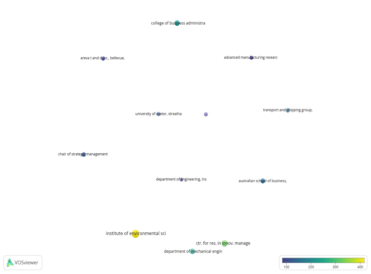 Para la identificación de las instituciones que colaboran en la generación y transferencia de conocimiento en la temática de GTI en instituciones militares y de defensa, se utilizó como criterio el nivel de citación con mínimo 100 citas (ver Figura 4); con base en este criterio se identificaron 8 instituciones, 4 de ellas son europeas, 2 americanas, 1 asiática y 1 del continente de Oceanía. Entre las instituciones están: la Universidad de Leiden, Instituto de Ciencias Ambientales, (Holanda), la Organización holandesa para la investigación científica aplicada (Holanda), la Universidad Noruega de Ciencia y Tecnología (Noruega), la Universidad de Brighton (Reino Unido); la Universidad de Tennessee, Colegio de Administración de Empresas, Knoxville (Estados Unidos); el Instituto de Tecnología y Ciencia, Departamento de Mecánica e Ingeniería, Pilani (India); la Universidad Memphis (Estados Unidos); la Universidad de Nueva Gales del Sur, Escuela Australiana de Negocios, Sydney (Australia) (Figura 8).