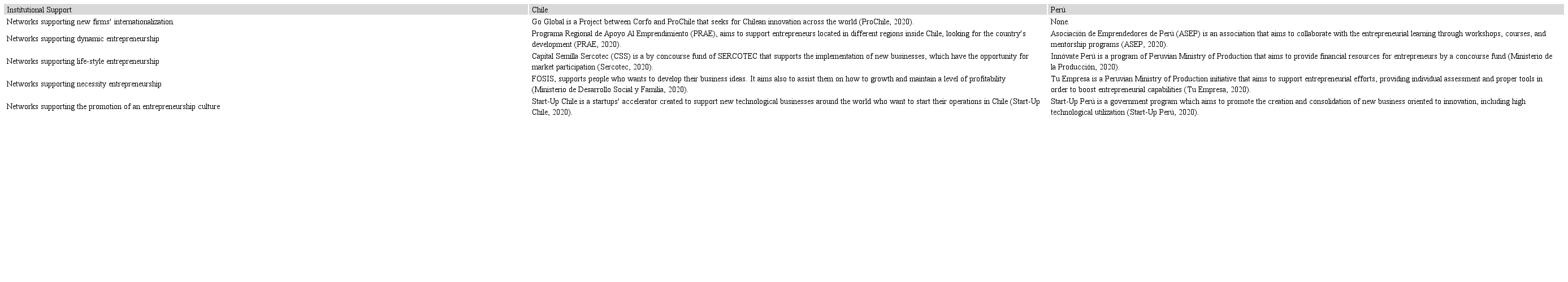 The study utilizes secondary sources, collecting data from entrepreneurial oriented programs’ official websites and available reports, which allow the analysis of several government initiatives from Chile and Peru, focused on promoting networks’ formation as an institutional support for entrepreneurs’ growth and performance capabilities. In order to do so, institutional support was divided into five factors: (i) firms with internationalization potential, (ii) dynamic entrepreneurship, (iii) life-style entrepreneurship, (iv) necessity entrepreneurship, and (v) promote an entrepreneurship culture. These factors for support facilitates the discussion later about how these institutions are focusing their efforts to assist entrepreneurial activities and allow to find which of these factors could be missing in some of the two countries under scrutiny. Hence, data was taken from official information repositories of these entrepreneurial oriented programs and organized according to these five support factors.