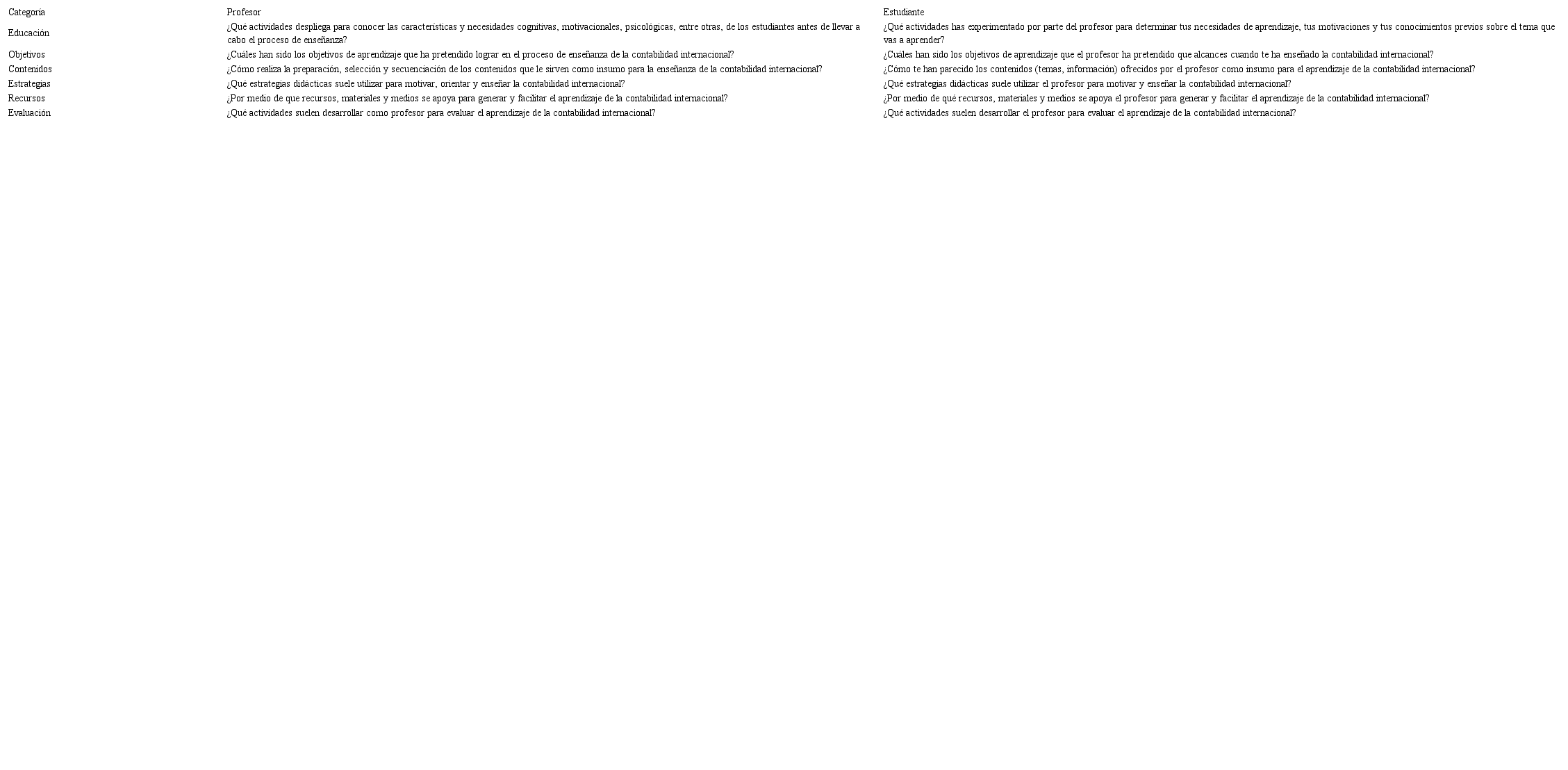 Para facilitar la resolución del cuestionario se diseñó por categoría una pregunta abierta con carácter descriptivo, para conocer las percepciones que tienen profesores y estudiantes sobre las estrategias didácticas que se utilizan en los cursos de contabilidad internacional.