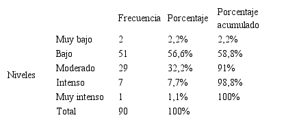 En correspondencia con el PAQ-A, se organizaron cinco niveles de AF: “muy bajo”, “bajo”, “moderado”, “intenso”, y “muy intenso” (Mesías, 2017), en concordancia con los siguientes rangos de puntuación promedio: 1-1,49; 1,50-2,49; 2,50-3,49; 3,50-4,49 y 4,50-5,0; estos rangos permitieron clasificar a los participantes del estudio, en consonancia con los cálculos que se pueden observar en la tabla 1, de la cual se deduce que: 2 (2.2%) de los escolares se clasificaron en un nivel muy bajo de AF, 51 (56.6%) en el nivel bajo, 29 (32.2%) en el nivel moderado, 7 (7.7%) en intenso, y solamente 1 (1.1 %) en el nivel muy intenso. Esta clasificación evidencia que existe una tendencia a que los adolescentes se ubiquen en el nivel bajo, seguido del nivel moderado, con un porcentaje acumulado del 88,8%; en menor porcentaje le siguieron los del nivel intenso, muy bajo y muy intenso, respectivamente.