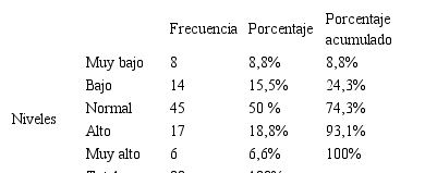 La batería de Coopersmith hizo posible clasificar a los adolescentes por el puntaje total de AE, en cinco categorías o niveles: “muy bajo”, “bajo”, “normal”, “alto”, y “muy alto” (Lizarazo, 2018; Mesías, 2017), en correspondencia con los rangos establecidos en el mencionado inventario. Los escolares participantes en el estudio se clasificaron como se indica en la tabla 2.