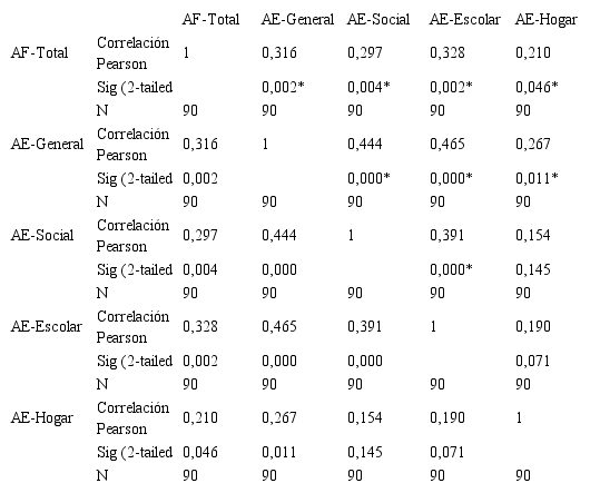 De la tabla 3, se tienen diez correlaciones, las cuales se generan entre las puntuaciones totales de la actividad física (AF-Total) y las puntuaciones de las dimensiones AE_general, AE_social, AE_escolar y AE_hogar, de las cuales, ocho fueron significativas al 5% (0,05) y dos son no significativas. En seguida, se describen las correlaciones entre la AF-Total y las cuatro dimensiones.