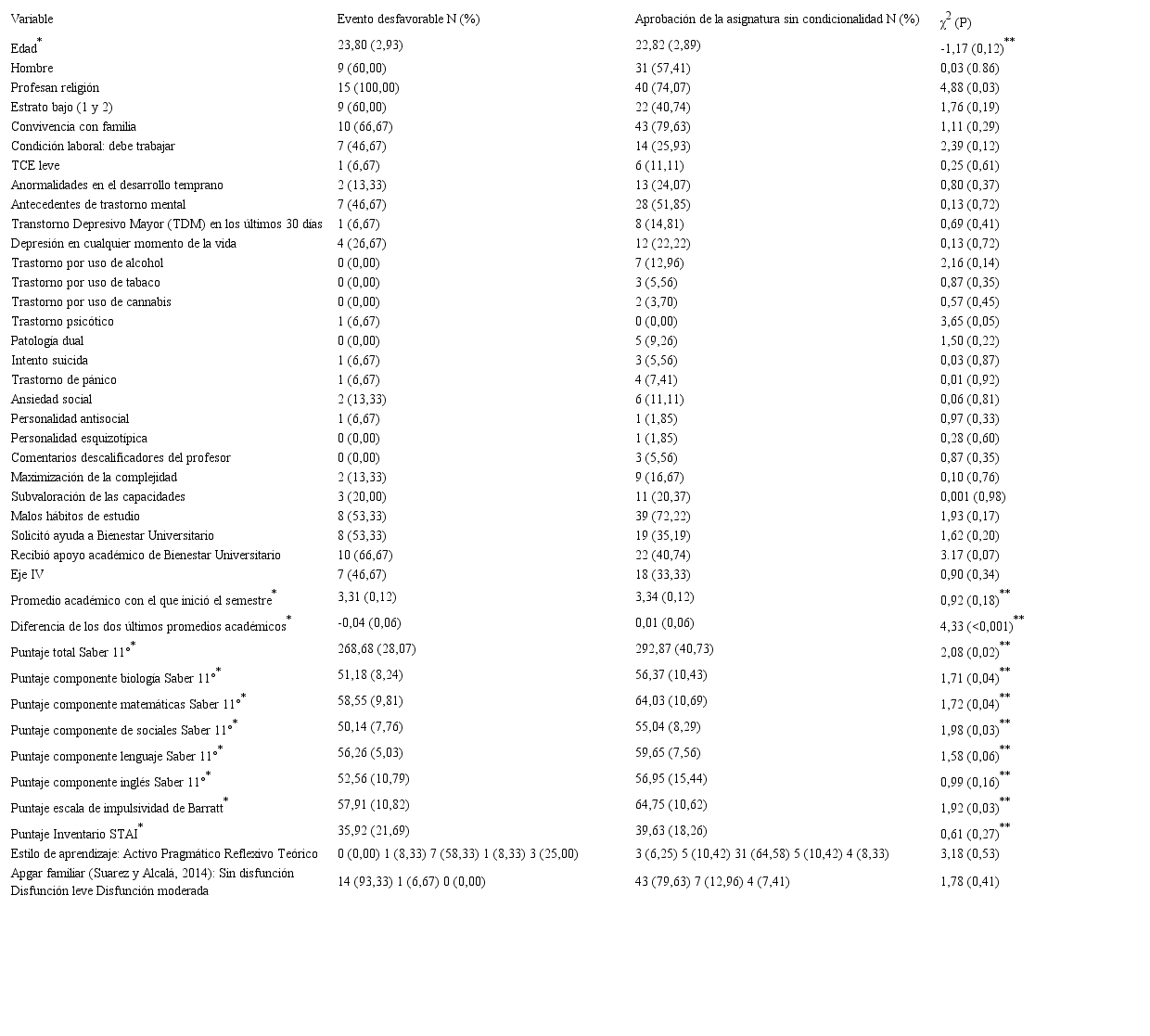 Se presentaron 15 desenlaces desfavorables, distribuidos de la siguiente manera: 6 estudiantes cancelaron la asignatura, 8 quedaron por fuera de la Universidad y 1 quedó con matrícula condicional. En la tabla 1 se presentan las diferencias en los factores sociodemográficos, clínicos y académicos, entre quienes aprobaron la asignatura, y los que presentaron un desenlace desfavorable.