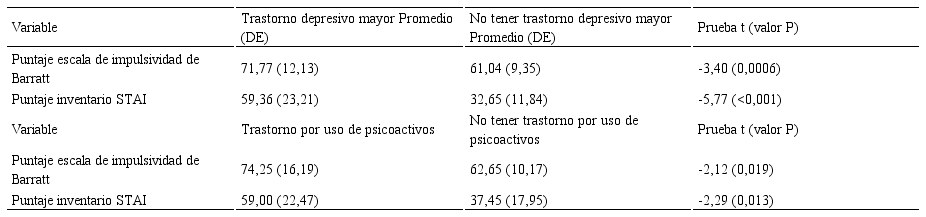 Análisis adicionales mostraron la asociación entre impulsividad y ansiedad, rasgo-ansiedad estado, y la presencia de trastornos mentales en la población de estudio. Véase la tabla 2.