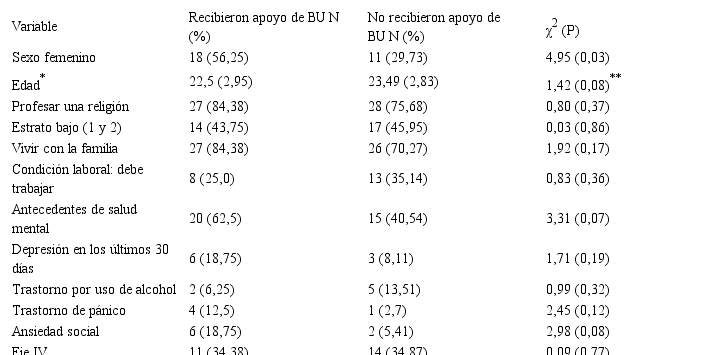 Así mismo, se realizó una caracterización de los 32 (46,38%) estudiantes, según si habían tenido o no apoyo académico de la División de Bienestar Universitario (BU). Véase la tabla 3.