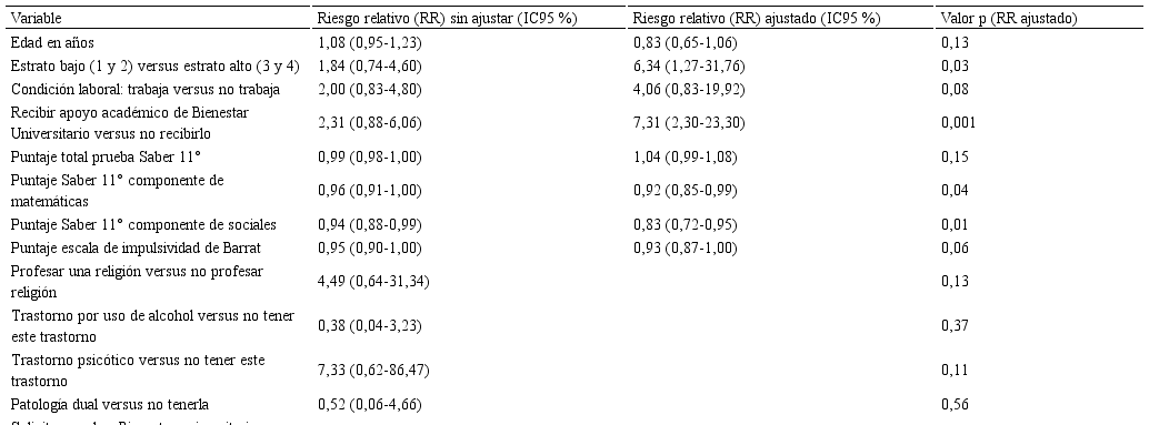 Factores sociodemográficos como la edad, estrato socioeconómico, condición laboral e identificarse con una religión; factores académicos como malos hábitos de estudio, promedio de notas con el que iniciaron el semestre, solicitar y recibir apoyo académico de Bienestar Universitario; y factores clínicos como trastorno mental por uso de alcohol, trastorno psicótico y patología dual, aunque no estuvieron estadísticamente asociados al desarrollo de eventos desfavorables, fueron tenidos en cuenta en la construcción del modelo multivariado final, por tratarse de potenciales factores de confusión descritos en la literatura.