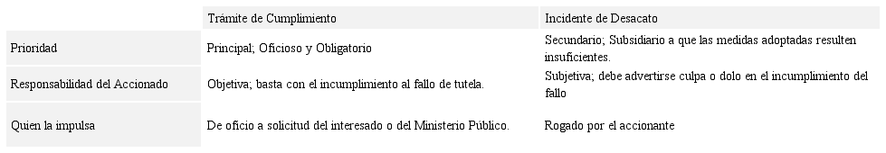 El primero es un trámite incidental por el cual el juez puede sancionar al responsable del incumplimiento con arresto y/o multa. El incidente debe resolverse en un término no mayor a diez días hábiles (Corte Constitucional, 2014).