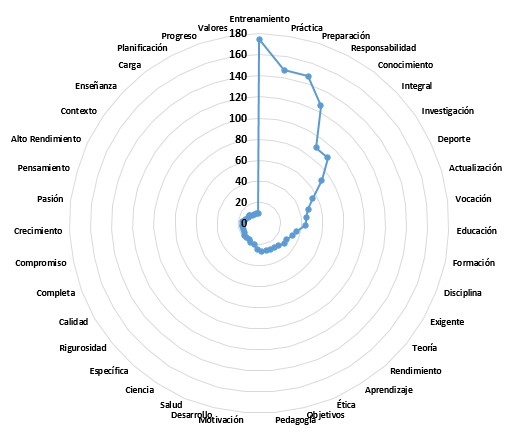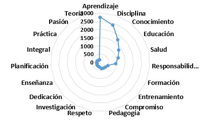 Finalmente emerge una categoría que da cuenta del campo particular del entrenador, descrita como disciplinar; es decir, aquellas designaciones que son propias de la formación de un entrenador deportivo o de actividad física. En esta categoría la palabra con mayor peso semántico es la salud (46,54%), palabra que además denota que en el campo especifico, el entrenamiento y el rendimiento deportivo no es lo único que prima; también, aparecen palabras que se esperaban desde lo específico de la formación de un entrenador, tales como: entrenamiento (20,52%), planificación (13,57%), preparación (10,29%), deporte (10,01%), entre otras.