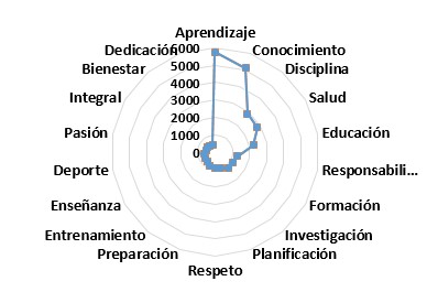En segunda instancia, la categoría que recoge un gran número de palabras definidoras y sus respectivos pesos semánticos es la categoría valórica, es decir, representaciones que dan cuenta de valores y principios que son fundamentales en su formación, entre los cuales se destacan la disciplina (65,87%), como el elemento principal; igualmente, aparecen palabras como: responsabilidad (34,66%), respeto (12,46%), integral (12,18%), compromiso (9,21%), pasión (8,79%), entre otras.