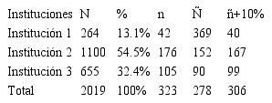 Cada estrato de la población se refiere a cada una de las instituciones. En cada caso se tomó proporcionalmente una muestra, de acuerdo al porcentaje de la población: Institución 1 (13.1%), Institución 2 (54.5%) e Institución 3 (32.4%).