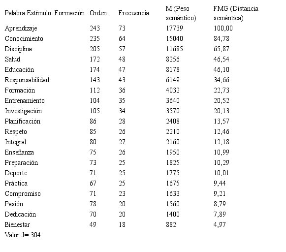La red semántica general sobre formación profesional fue definida con un total de 304 palabras (Valor J) que conforman la matriz total, lo que dio cuenta de una gran riqueza semántica. La representación total hegemónica, es decir, las principales palabras que determinan esta representación, estuvo conformada por 20 palabras (ver tabla 2) las cuales se escogen a partir del PQ, o sea aquellas palabras que tienen un valor FMG igual o mayor a 5%. La palabra principal fue aprendizaje (100%), seguida de conocimiento (84,78%), disciplina (65,87%), salud (46,54%), educación (46,10%) y responsabilidad (34,66%), las cuales en conjunto con las otras palabras del conjunto SAM proponen una serie de categorías o multi-significados que agrupan estas representaciones.