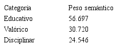 Las categorías que agruparon las diferentes palabras de las RS, dadas por los estudiantes, fueron (ver tabla 3): educativo (M=56.697), valórico (M=30.720) y disciplinar (M=24.546), lo que muestra que el componente educativo fue lo más relevante. Su representación social principal está en torno a la formación, y de esta categoría la palabra definidora principal es el aprendizaje (100%). En pocas palabras, los estudiantes dan gran relevancia a los diferentes conocimientos y saberes que adquieren en su proceso formativo.
