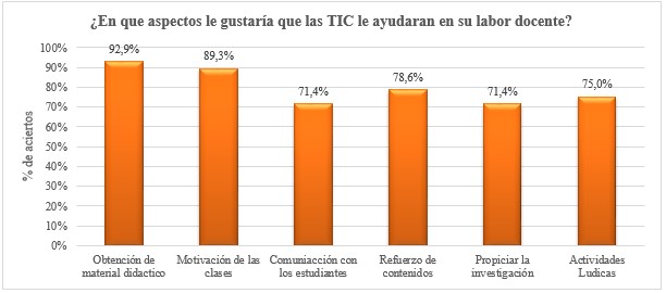 Según la figura 2, el 92.9 % de los docentes emplearían las TIC para la obtención de material didáctico; igualmente, el 89.3 % las utilizarían para la motivación de las clases. Además, se halló que el 71.4 % las usaría para la comunicación con sus estudiantes; asimismo, el 78.6 % las aplicaría para el refuerzo de contenidos, y el 75.0 % para actividades lúdicas. Finalmente, el 71.4 % expresa que las aprovecharía para propiciar la investigación.