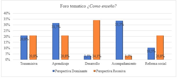 Como se puede observar en la figura 3, las formas de enseñar tienen una relación significativa con los hallazgos, evidenciados en la aplicación del inventario TPI, dando como resultado que los docentes sienten preferencia por la perspectiva de acompañamiento (33.5 %), mientras que la perspectiva aprendizaje obtuvo 31.7 %, seguido de la perspectiva transmisiva con 20.8 %; de igual manera, se conoció que las perspectivas recesivas son la reforma social (20.8 %) y la de acompañamiento (3.5 %).