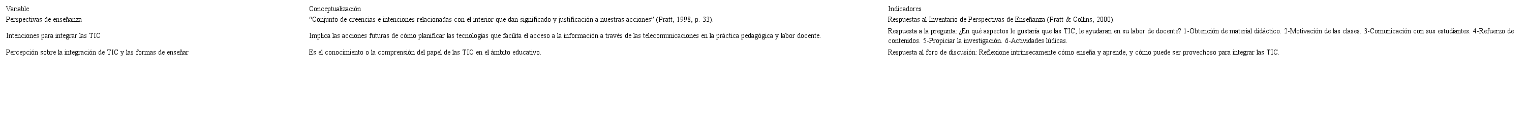 La tabla 1 presenta las variables perspectivas de enseñanza, intenciones para integrar las TIC y la percepción sobre la integración de TIC y las formas de enseñar, con la respectiva conceptualización e indicadores que las componen.
