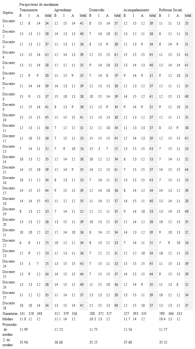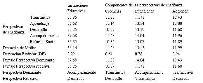 En la tabla 2 se presenta una descripción general acerca de las perspectivas de enseñanza, así como los componentes creencias, intenciones y acciones, y los totales de esta. También da a conocer los promedios y sumatoria de medias, a nivel colectivo, de los docentes.