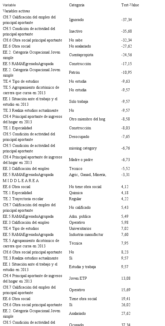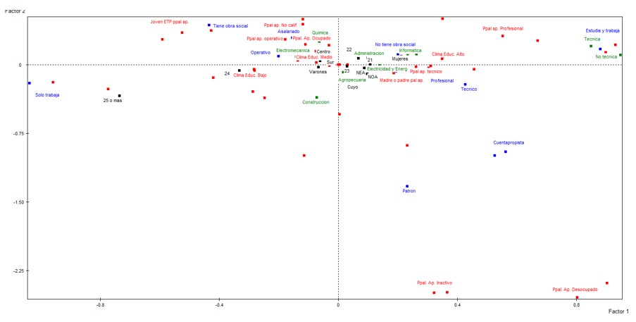 El eje del factor separa las categorías y casos, dejando de un lado a los egresados que provienen de hogares con principales aportantes desocupados e inactivos[6], de aquellos que provienen de hogares cuyo principal aportante se encuentra ocupado.