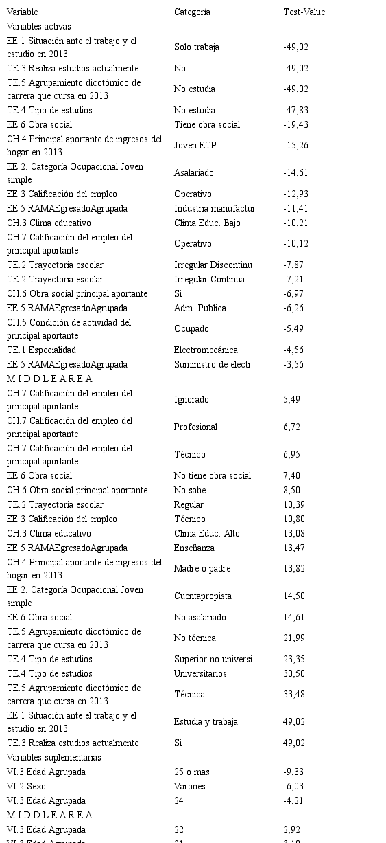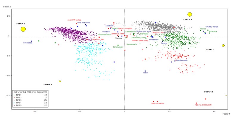 Debido a que el objetivo de este artículo se centra en la construcción de una tipología de inserción laboral y educativa de los egresados ETP, se utilizaron las dos técnicas mencionadas. El análisis de correspondencias múltiples (ACM), para identificar los principales factores de diferenciación dentro de los egresados y, posteriormente, el análisis de clasificación (ACL) para la conformación de grupos o tipos diferenciados en relación con los factores.