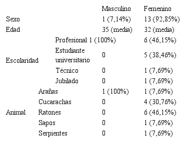 La cuarta parte de la población que respondió voluntariamente al llamado a participar en la investigación tenía fobia específica a animales. En el 46,15 % predomina la fobia específica a los ratones, seguido por la fobia a las cucarachas, con el 30,76 %; la fobia a las arañas, sapos y serpientes está en tercer lugar con igual porcentaje (7,69 %).